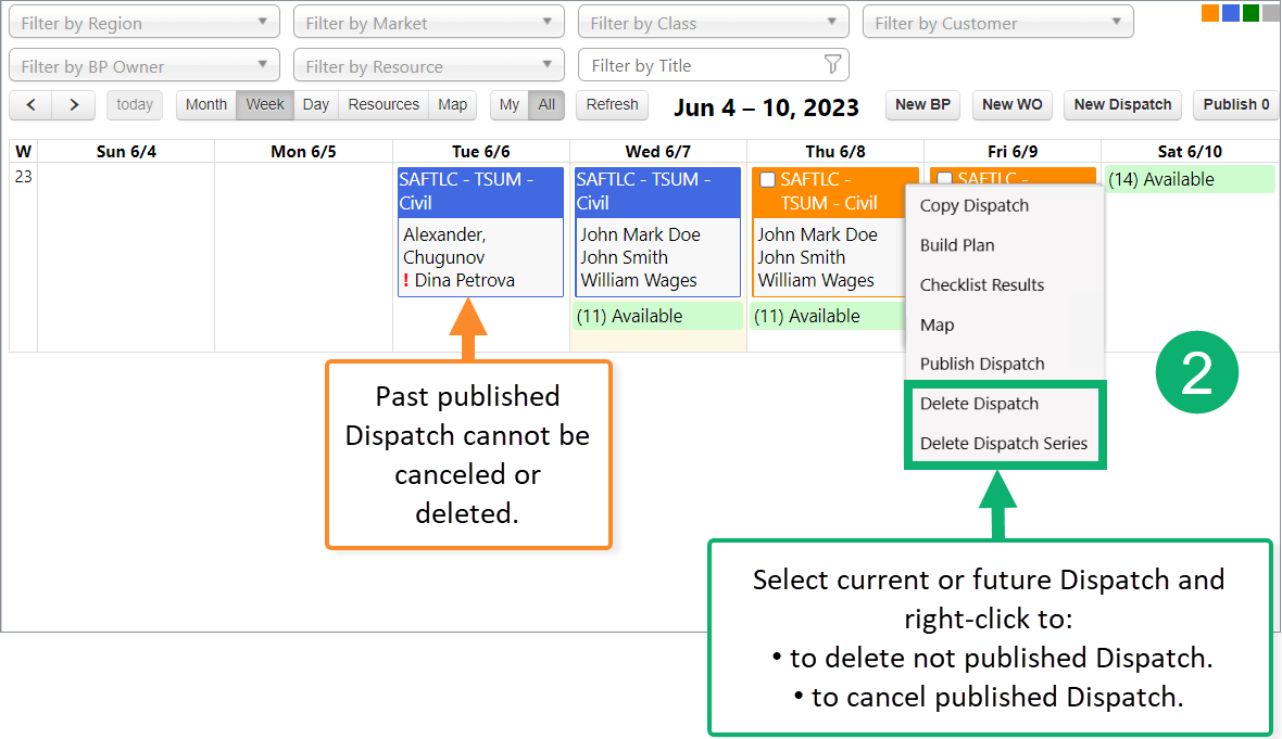 - You can only cancel a published Dispatch Schedule for current or future dates.