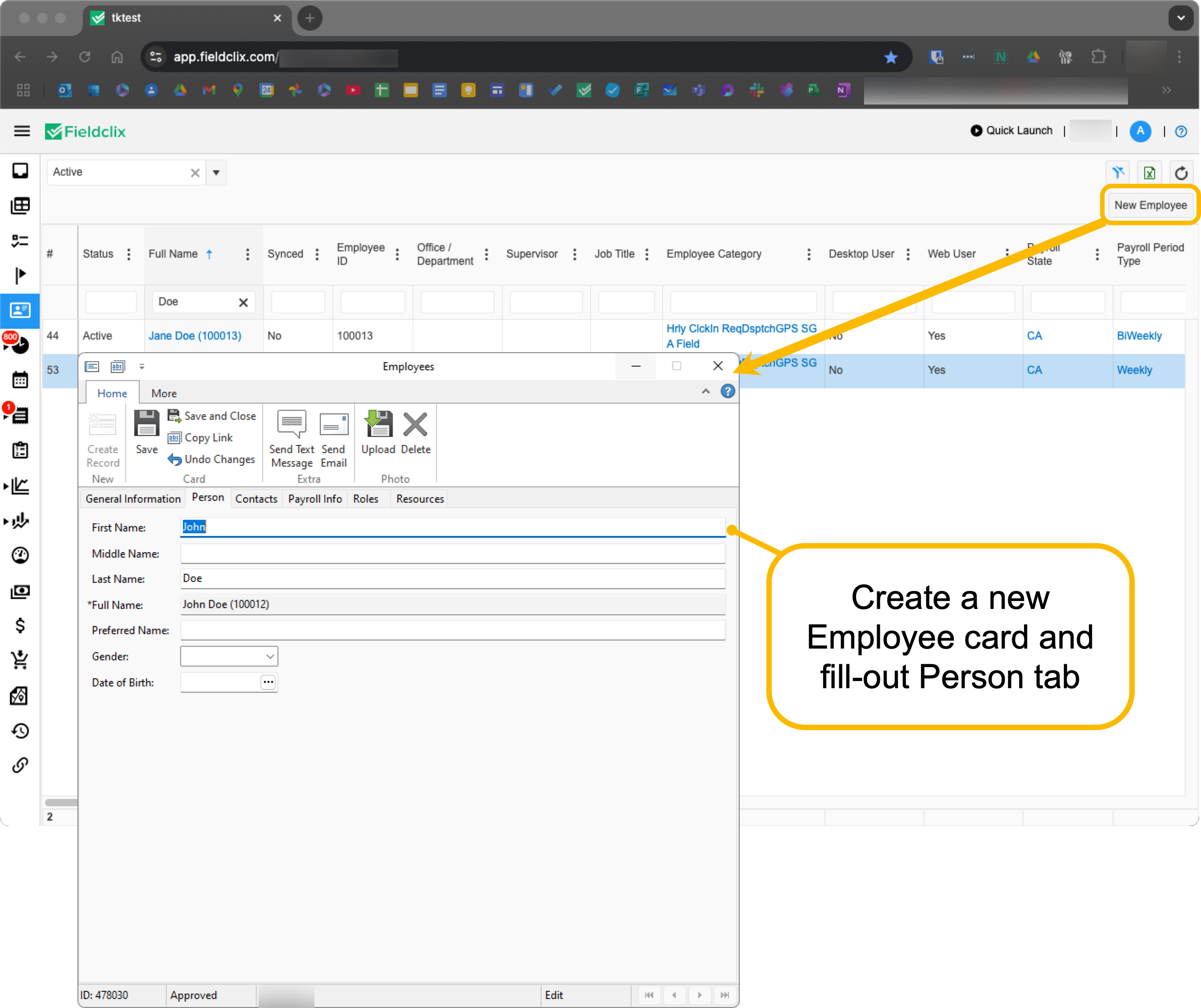 It is necessary to onboard any new employee into FCX, even if the employee in question will not directly interact with FCX in their day-to-day work. There are many reasons for this but one is that their labor is important to a company’s Job Costing and will need to be captured somehow.These directions are focused on onboarding direct, or “W2,” employees. Contractors are different and may need to be onboarded in certain circumstances. Reach out to support@fieldclix.com for more information on this.To onboard an Employee in FCX you will simply create and fill-out the fields on several Reference Record “cards” These instructions will detail the recommended order of operation and how to fill-out all fields.