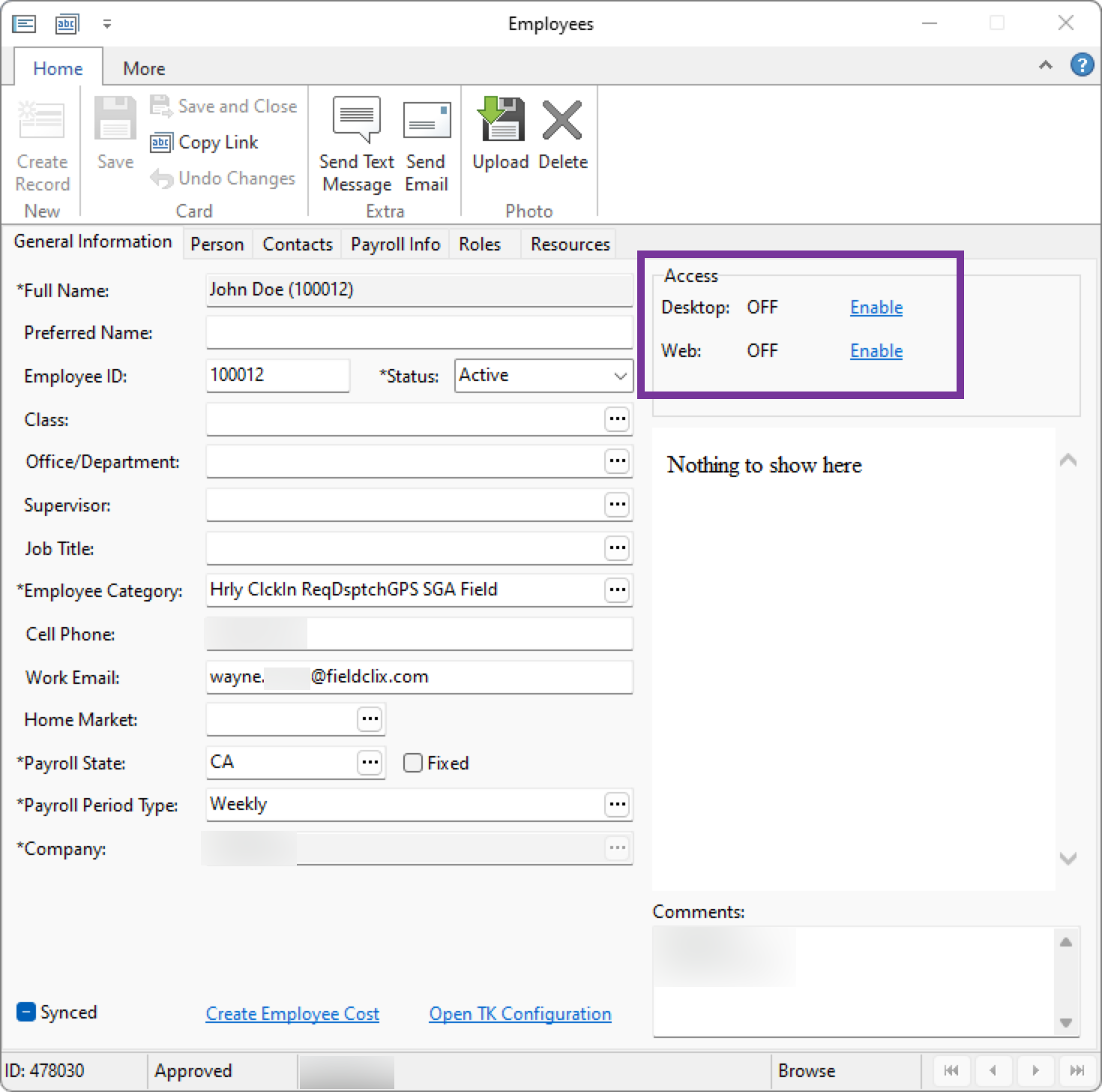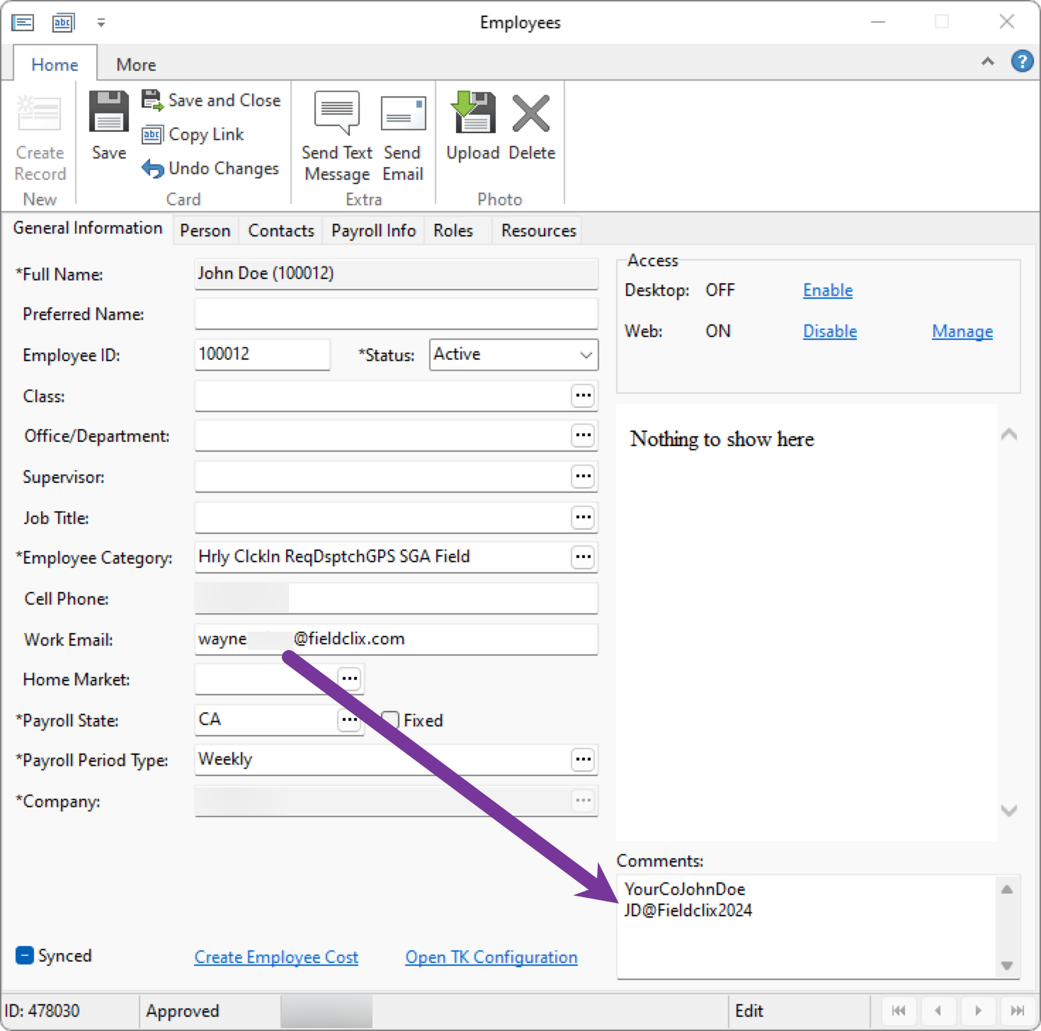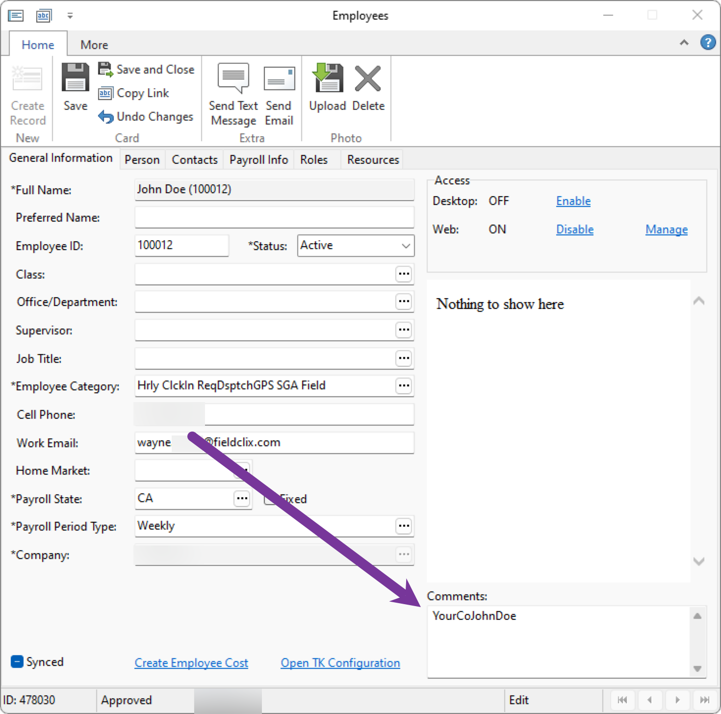 - Save your changes to the Employee card (the pasting of the username into the Comments box)