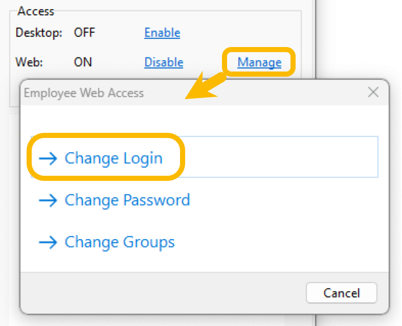 NOTE In the future you may be asked to retrieve the employee's password. You cannot view the password in plain text - clicking "Manage" and "Change Password" only allows you to create a new password (nothing prevents you from setting it the same as before)