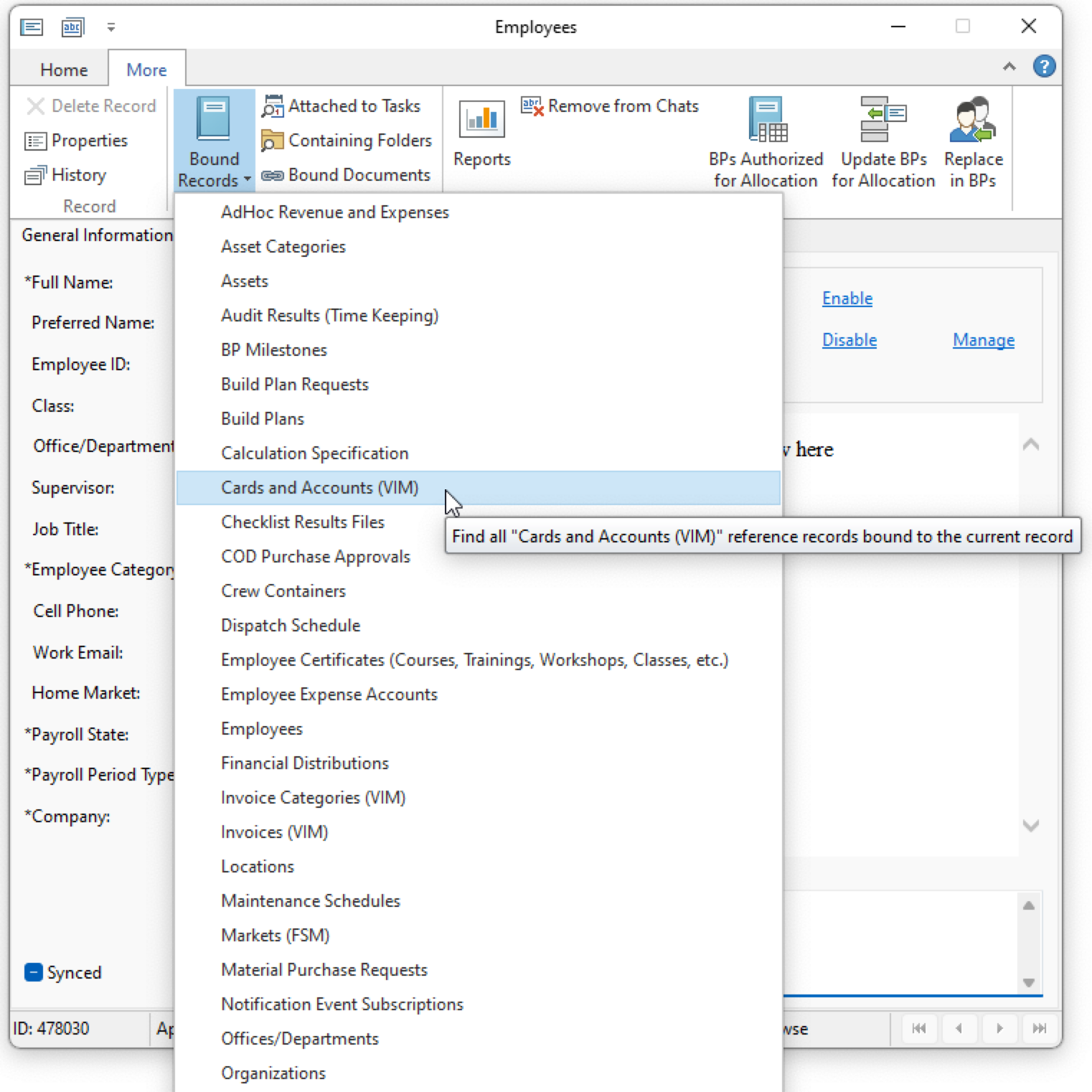 - On the ribbon More tab, click Bound Records and select Cards & Accounts