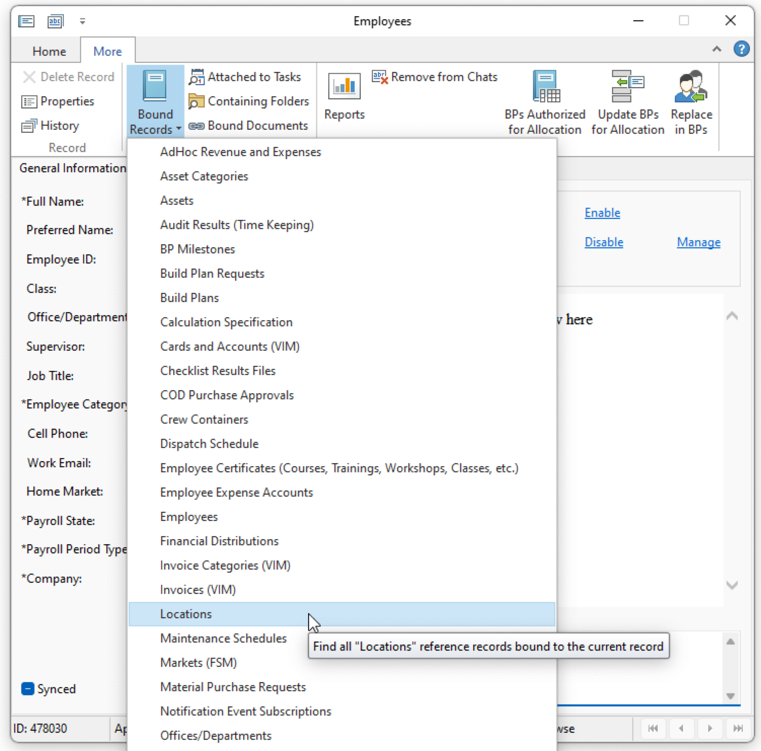 - From the ribbon More tab, in the Navigation group, click Bound Records and select Locations
