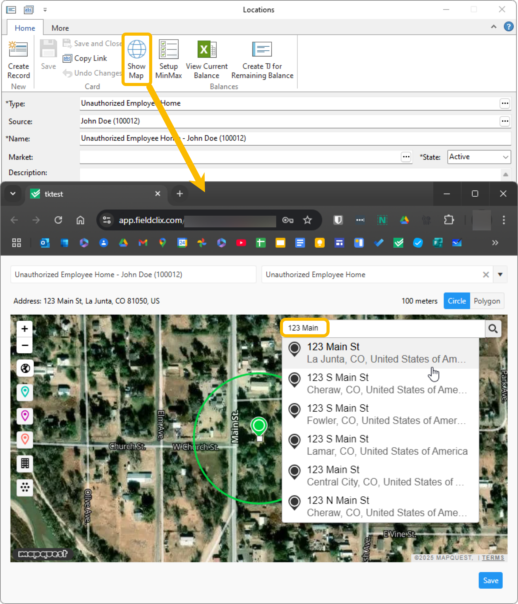 - Search for and select an address for the location and then Save to apply this change to the Location record