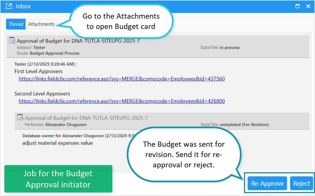 Reject — transfers the Budget to the rejected status. Again, comments are required to complete the job. The Budget Approval initiator will receive a notification about Budget rejection.