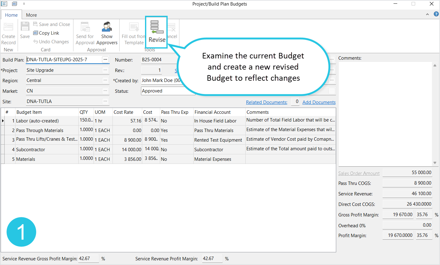 Use Revise option in the Budget card to reallocate Budget funds, increase or decrease Budget amounts.