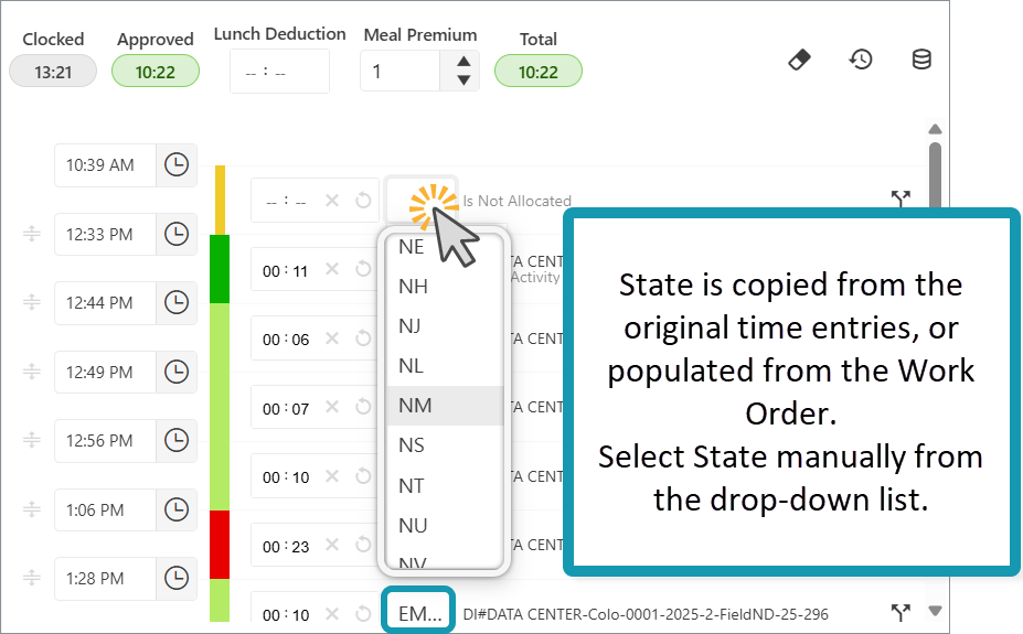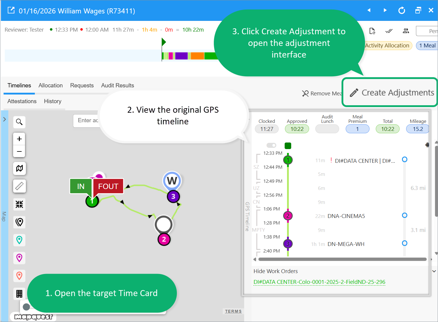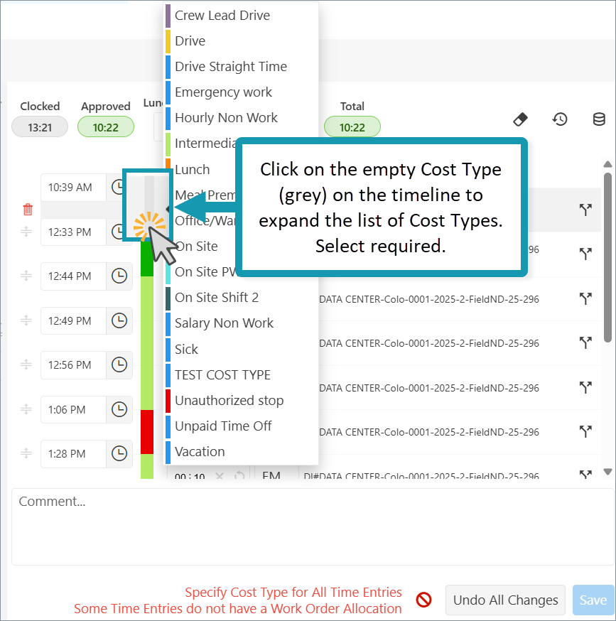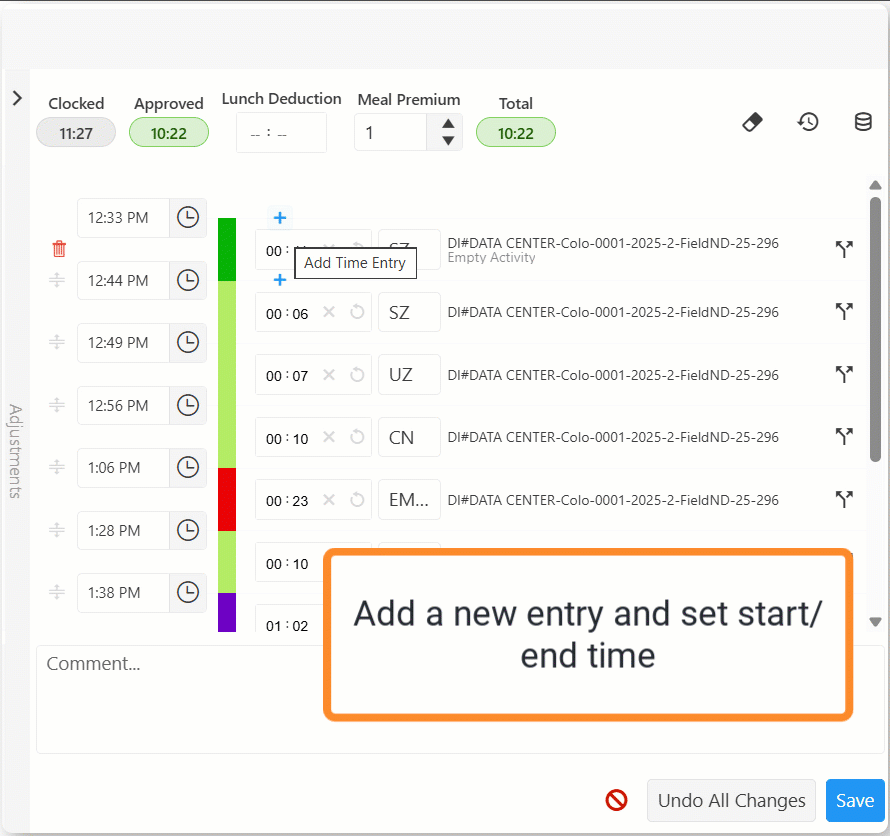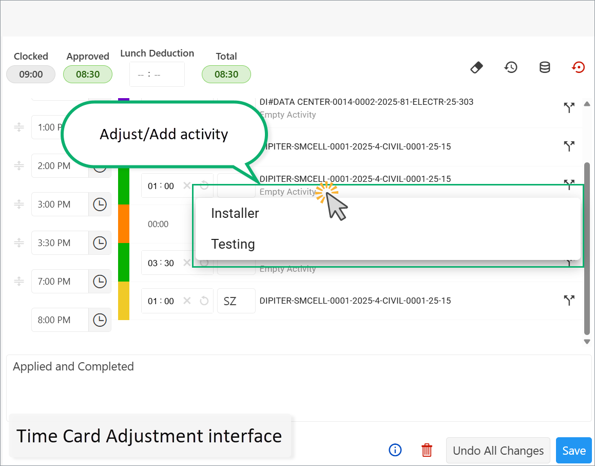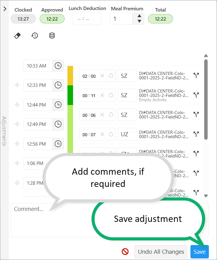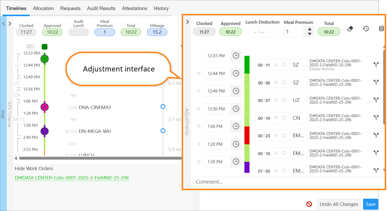 Once in the adjustment interface, modify the timeline as needed: adjust times, add periods, clear/restore hours, or allocate to Work Orders.