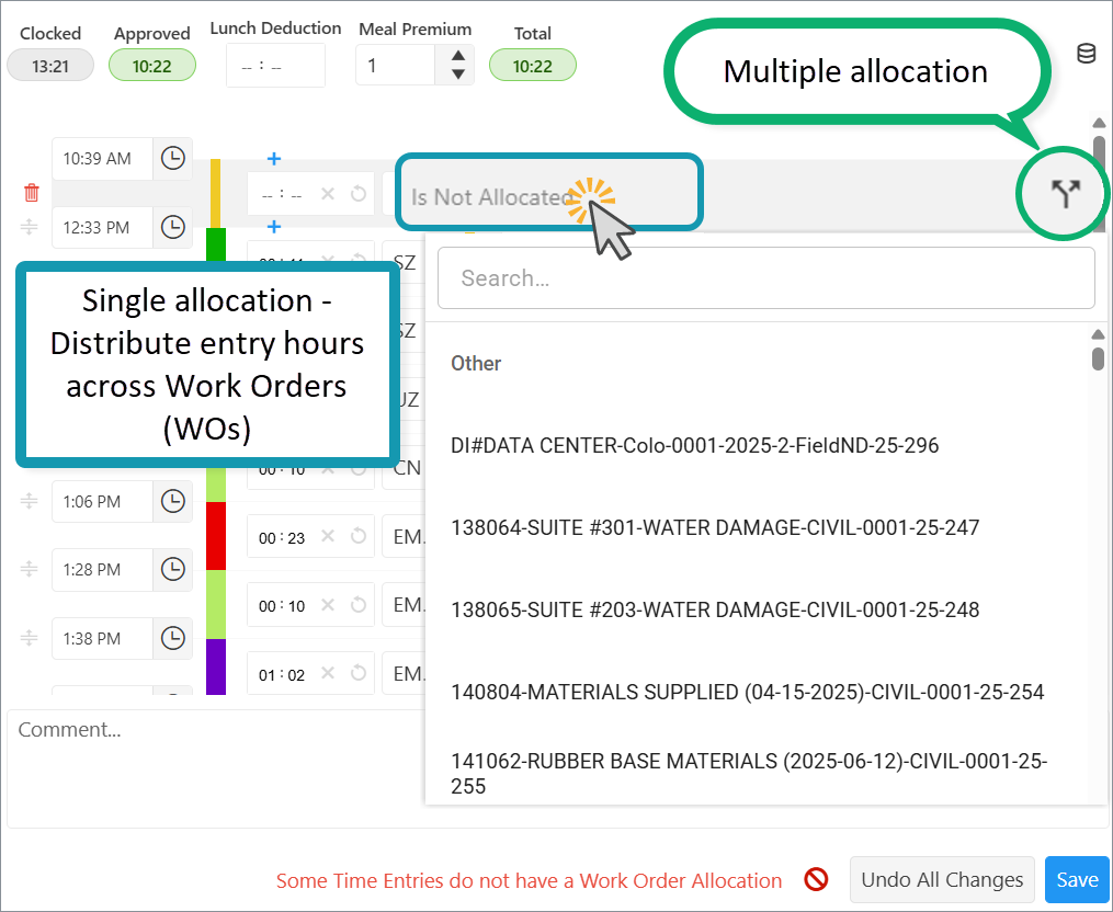 - Allocate Unallocated — allocates all Time Entries with empty allocation to the selected Work Order(s).
