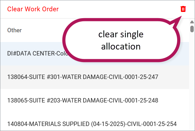 - To delete the allocation, clcik on the Clear Work Order Trash icon in the drop-down list.