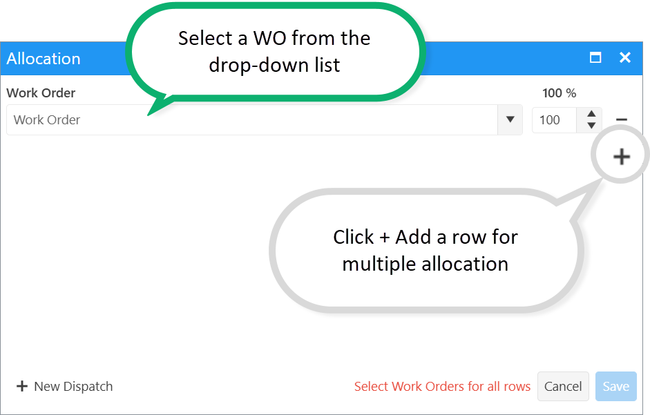 - Return to the allocation window and select the generated Work Order from the drop-down list.