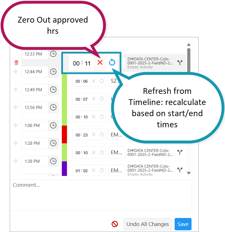 - Refresh from Timeline: Click Refresh Approved Hours to recalculate based on start/end times.