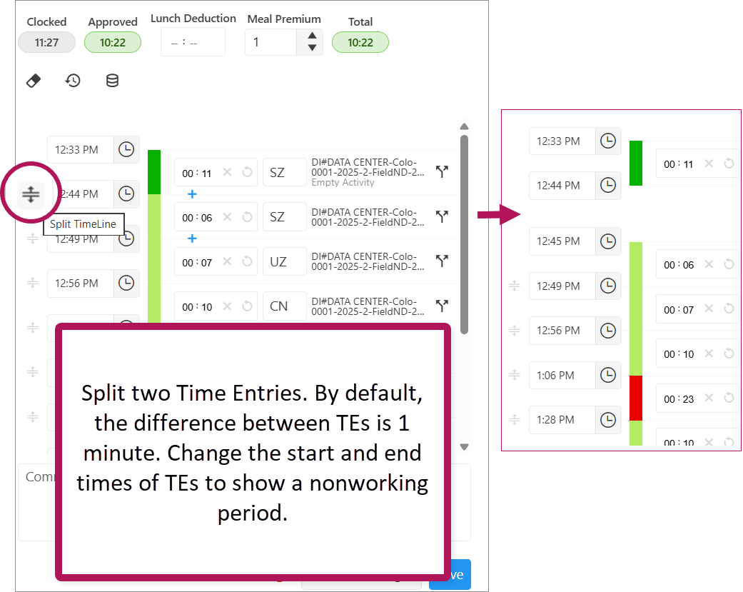 Use Time Split to divide the timeline and display nonwork time. For example, to show that an Employee took a break, or didn't clocked-in for some period of time.