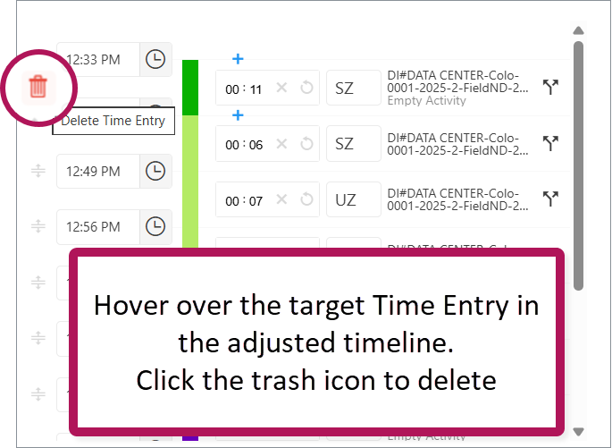 A Time Entry in the adjusted timeline represents a time period. Edits here do not affect original Time Entries records.