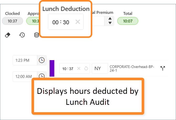 - Displays hours deducted by Lunch Audit and populates to the Applied Lunch field in the Time Card.