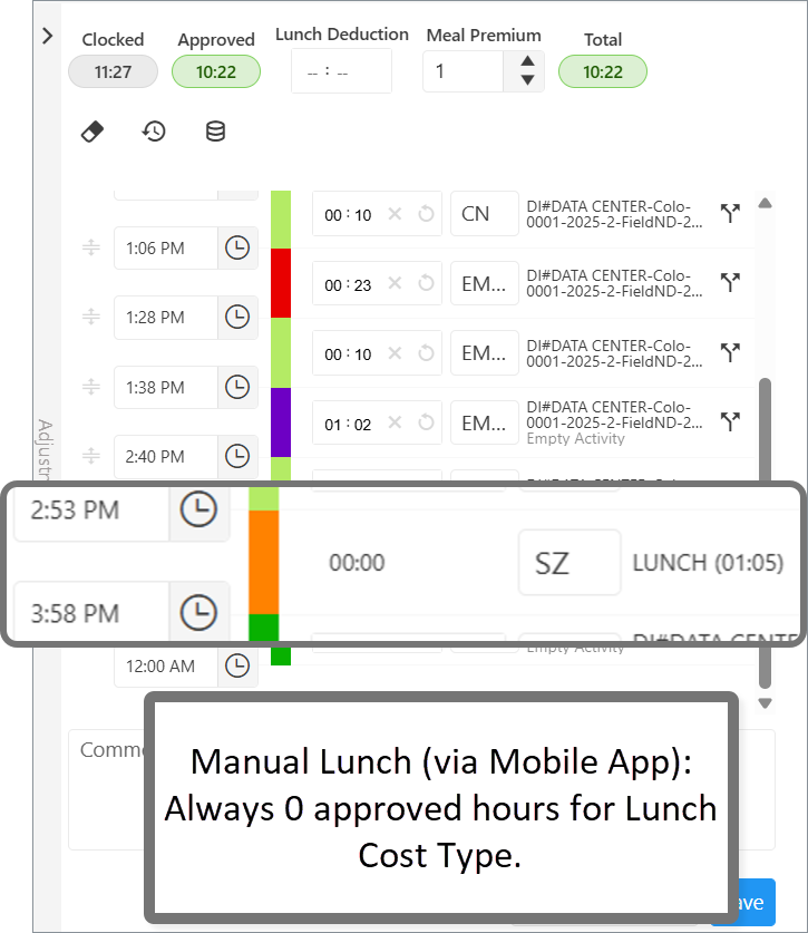 - Manual Lunch (via Mobile App): Appears on both original and adjusted timelines.