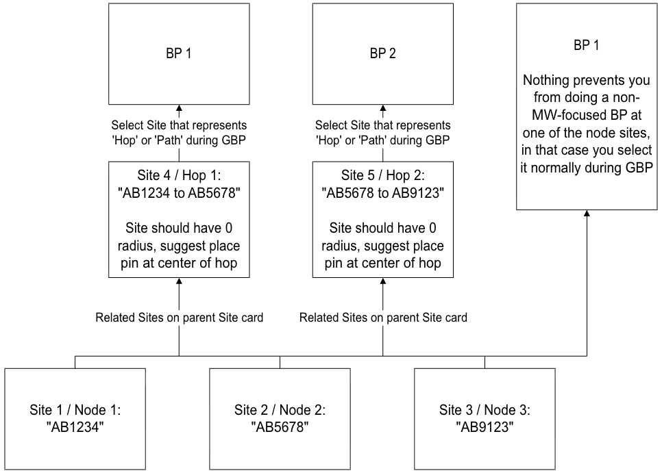 The below diagram demonstrates what the structure of BPs and Sites might look like when doing a MW project: