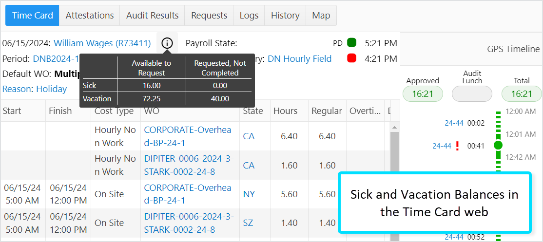 After a while, William has taken another 16 sick hours, which have been completed by a Reviewer or TK Manager. This means that as soon as a time off request is completed, the reason hours appear in the Time Card payroll allocation table.