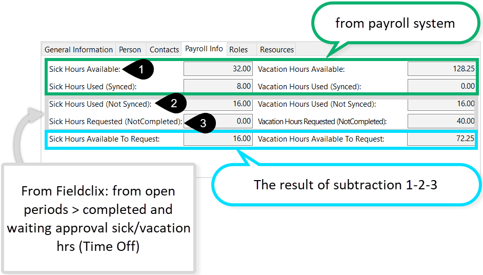 Vacation Hours Available to Request is difference between Vacation Hrs Available - Vacation Hrs Used Not Synced - Vacation Hrs Requested Not Completed.