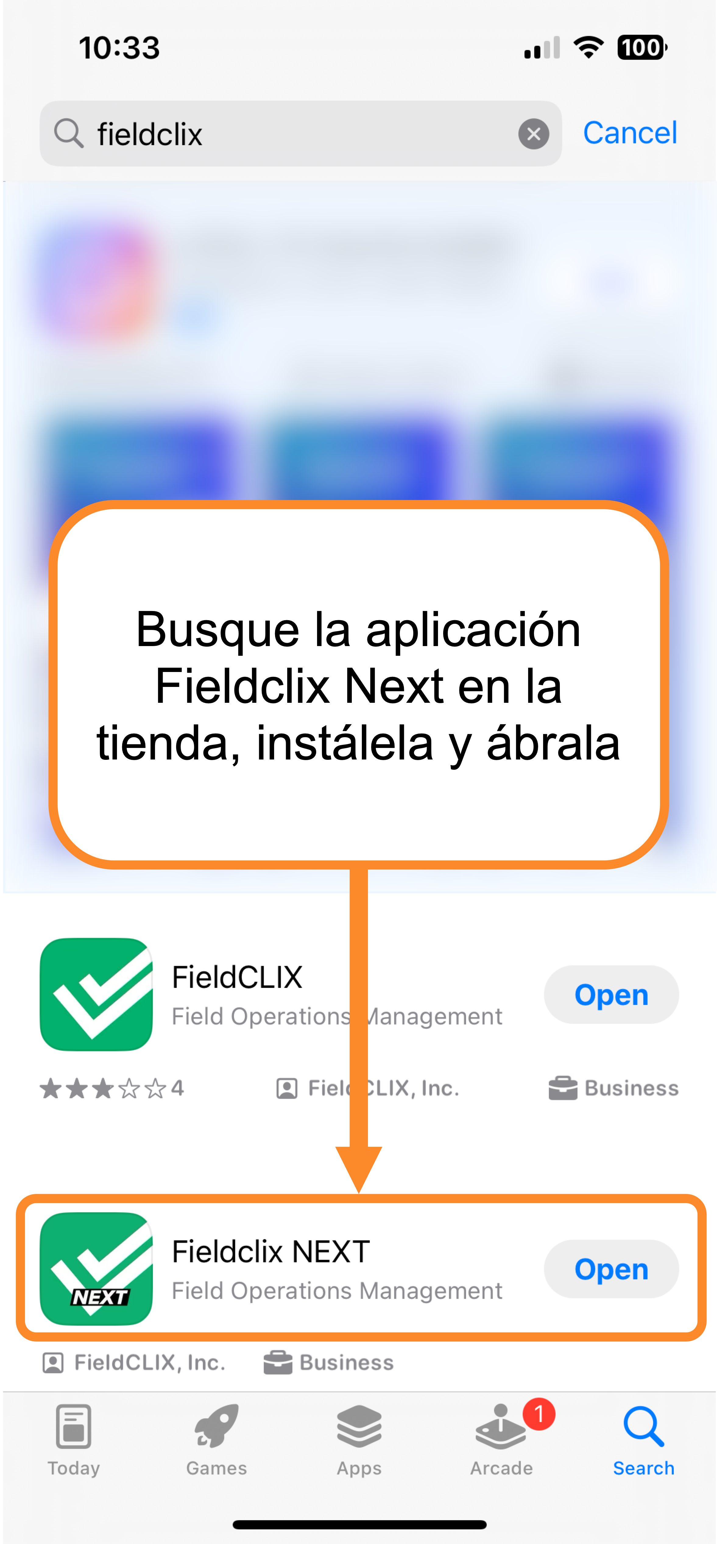 Actualmente, hay 2 aplicaciones Fieldclix en la tienda. Una se llama simplemente "Fieldclix" y la otra se llama "Fieldclix Next". Su empresa utiliza Fieldclix Next, por lo que debe descargar esa. ¡La otra aplicación no funcionará con sus credenciales!