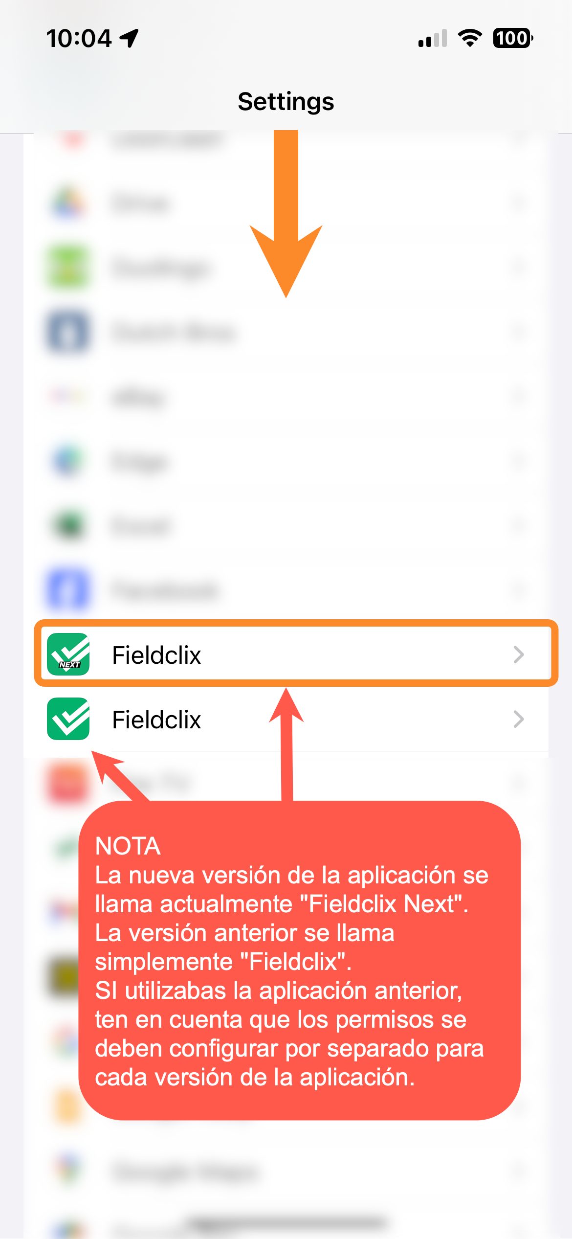 En iOS, simplemente desplácese hacia abajo, más allá de la configuración estándar, hasta llegar a la lista de todas las aplicaciones del dispositivo. Busque "Fieldclix Next" en esta lista.