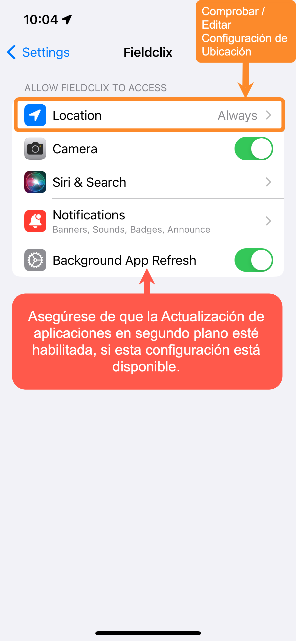 • Compruebe que los Permisos de Ubicación Estén Configurados en “Siempre” y Que la Ubicación Precisa y la Actualización de Aplicaciones en Segundo Plano Estén Habilitadas, Ei Están Disponibles