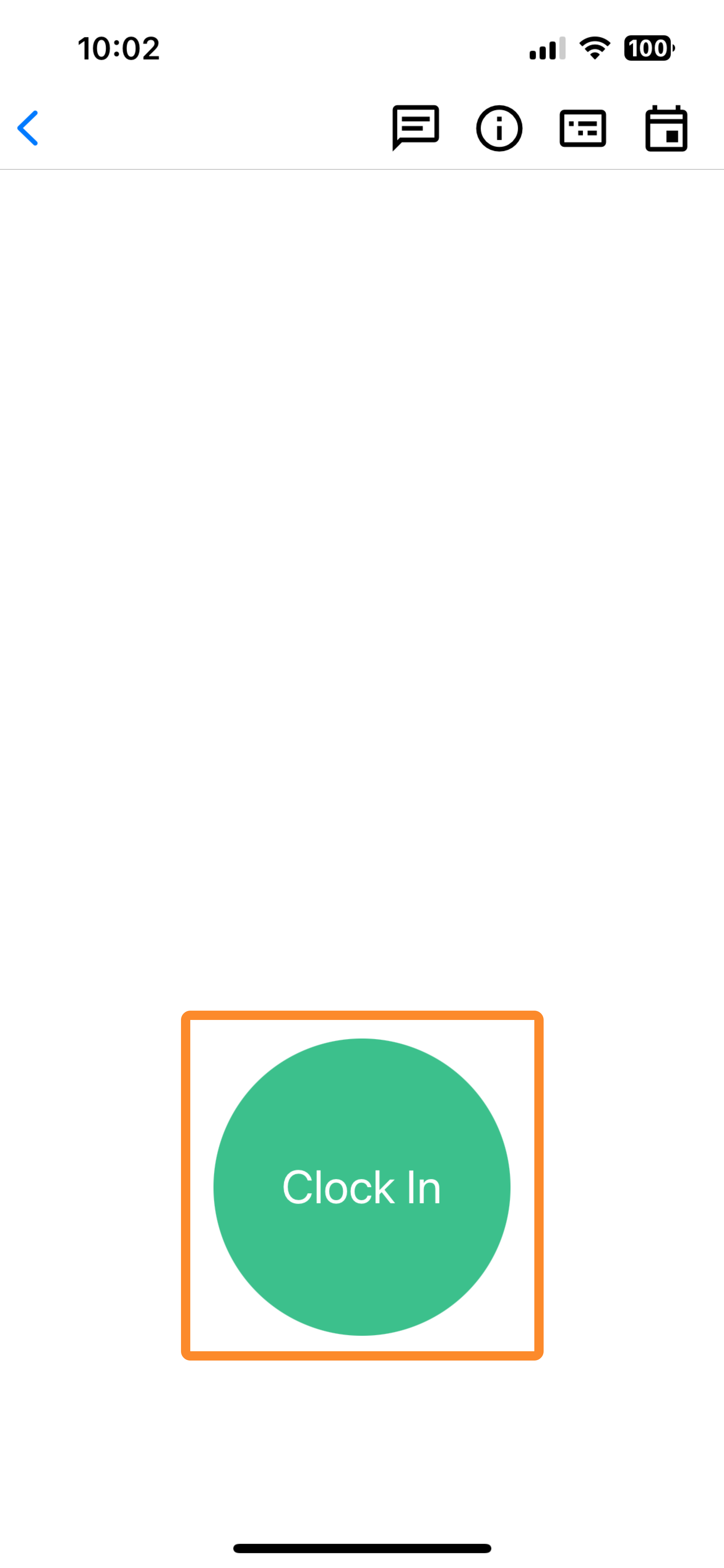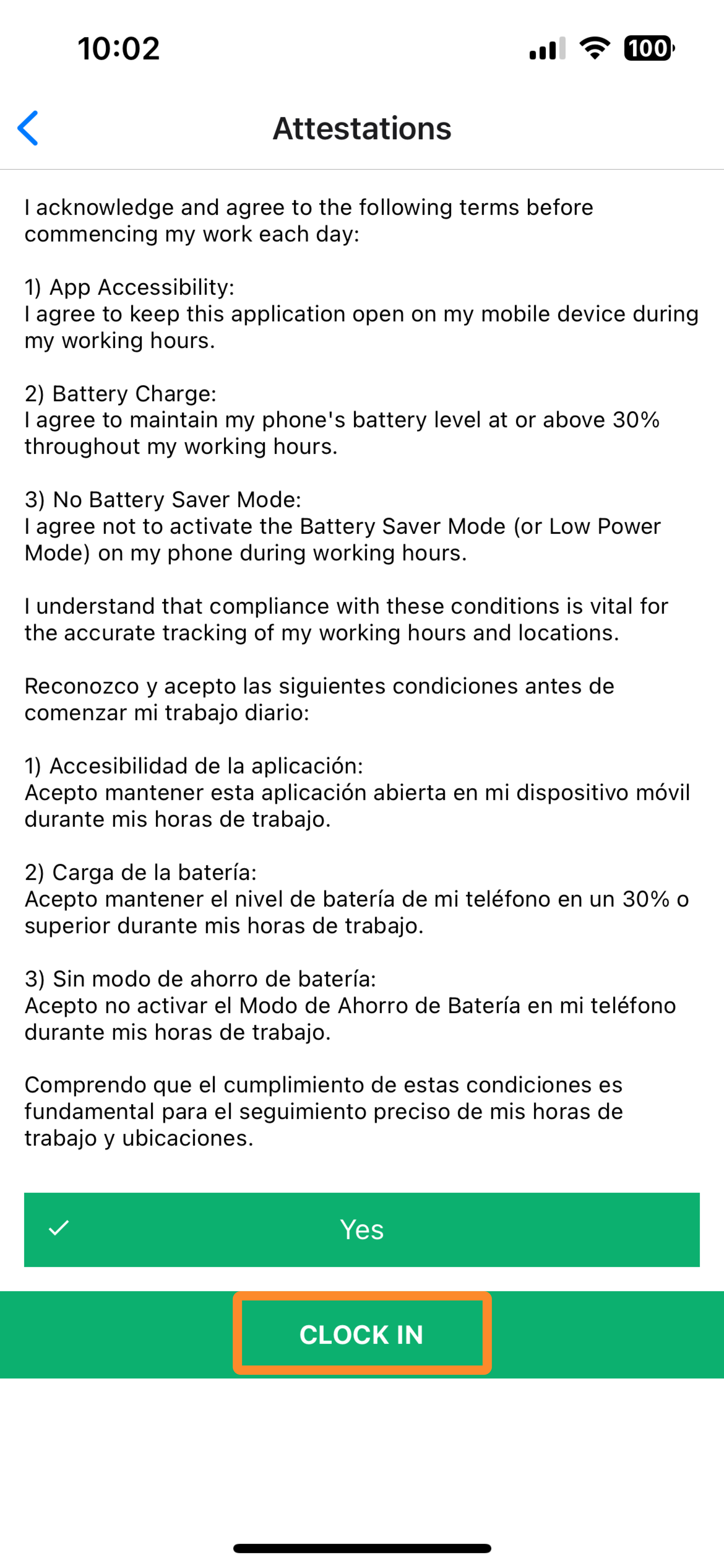 SI hace "Check-In", verá un botón amarillo/naranja que dice "Check-In". La mayoría de los usuarios verán un botón verde que dice "Clock-In". Si no ve un botón para registrar/fijar, es posible que no tenga acceso para registrar el tiempo en la aplicación (esto suele suceder con los empleados asalariados). Si no tiene acceso para registrar el tiempo y cree que debería hacerlo, comuníquese con su supervisor o con el soporte de Fieldclix.