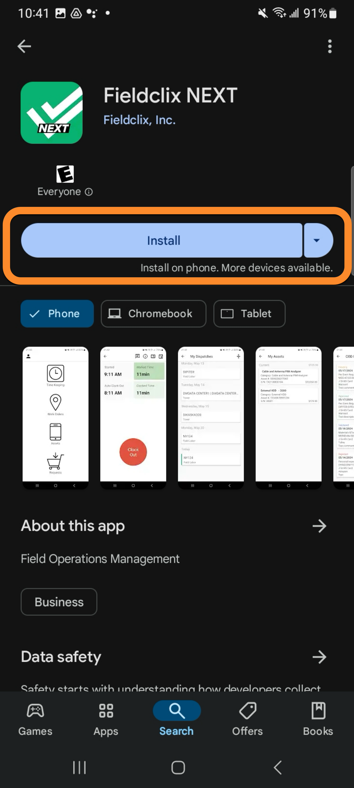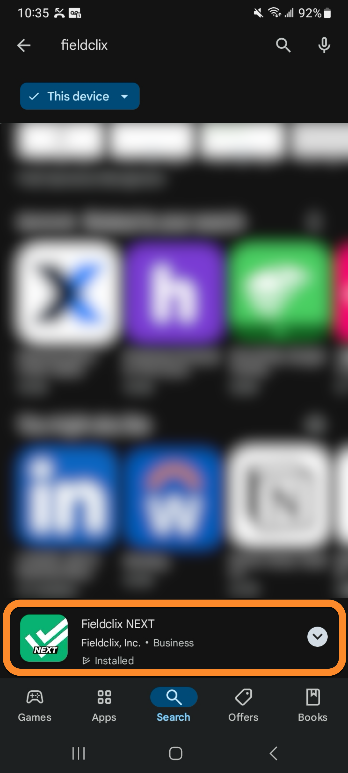 Actualmente, hay 2 aplicaciones Fieldclix en la tienda. Una se llama simplemente "Fieldclix" y la otra se llama "Fieldclix Next". Su empresa utiliza Fieldclix Next, por lo que debe descargar esa. ¡La otra aplicación no funcionará con sus credenciale!