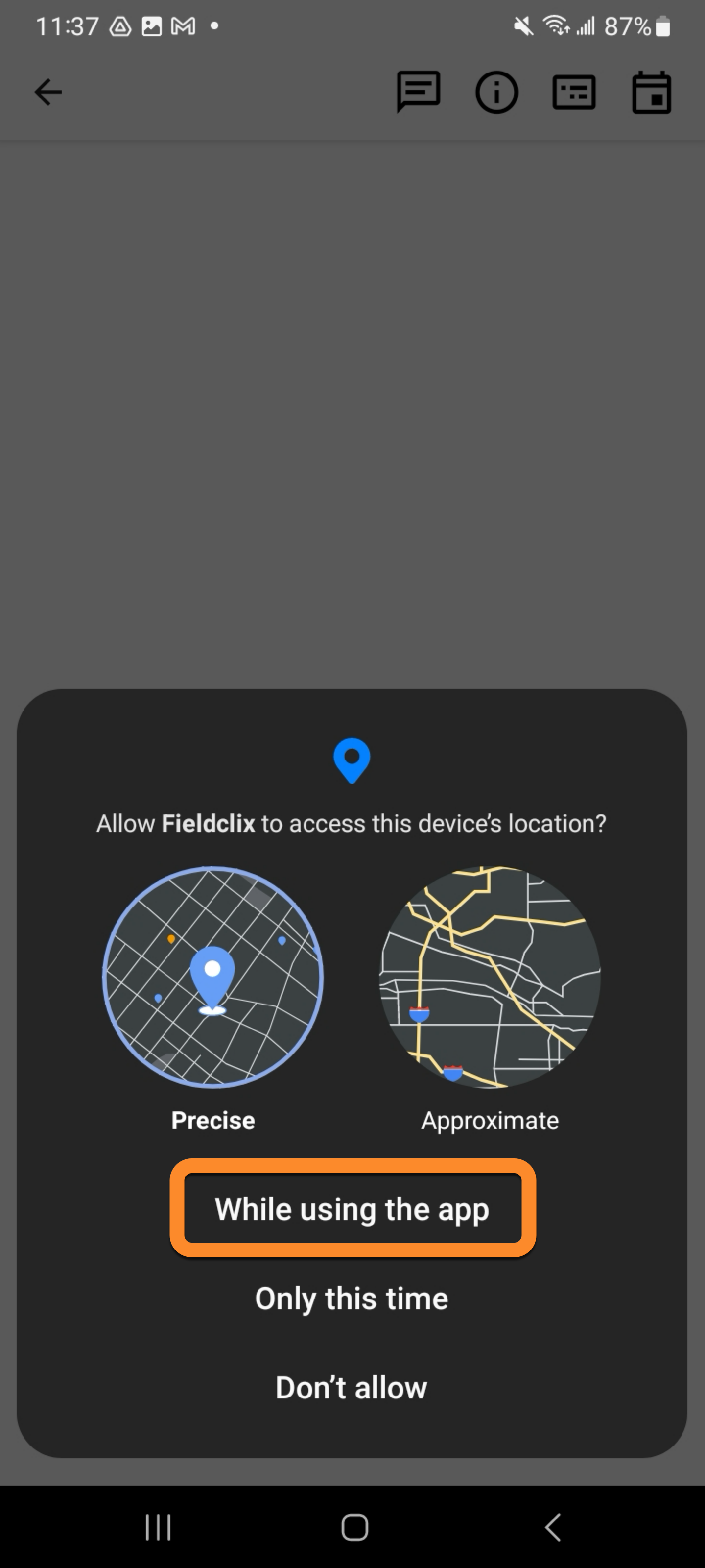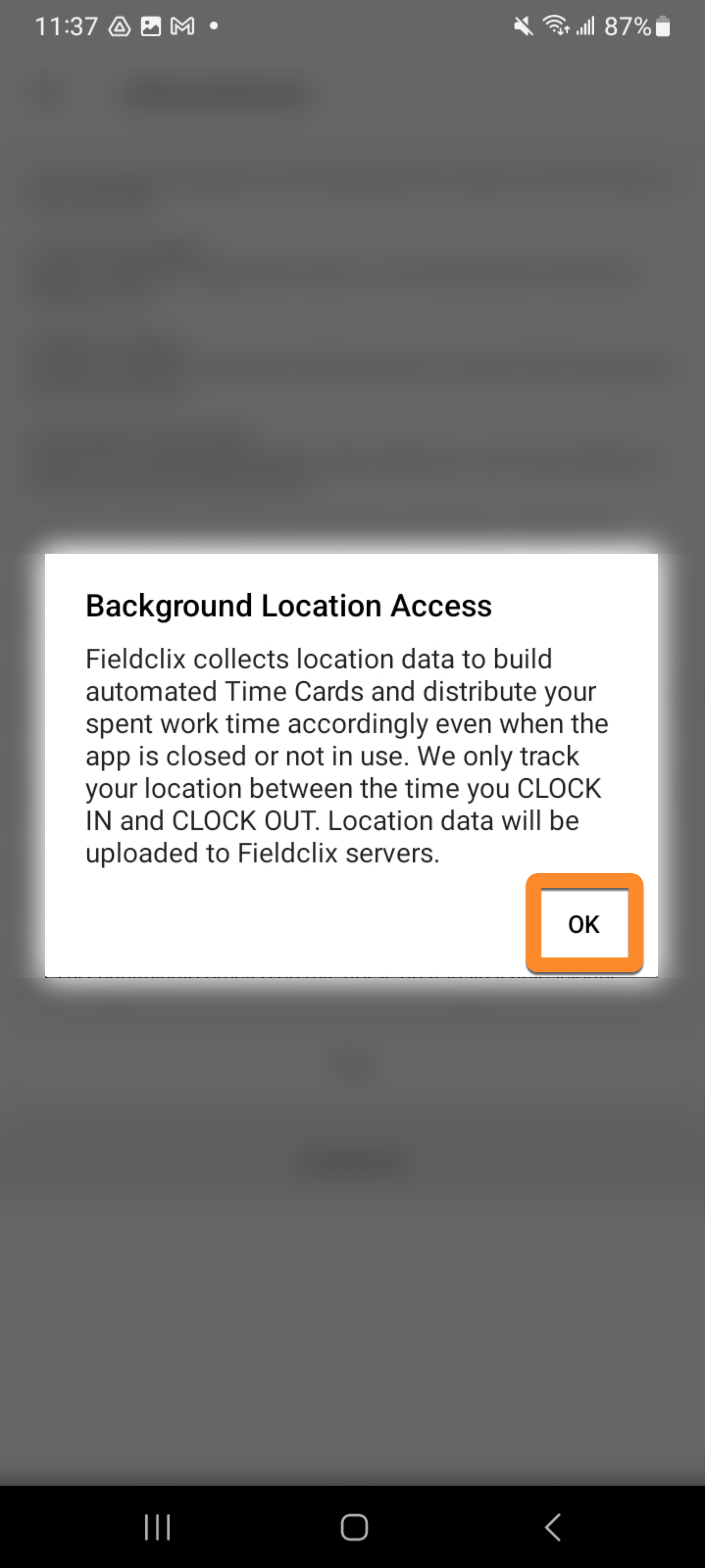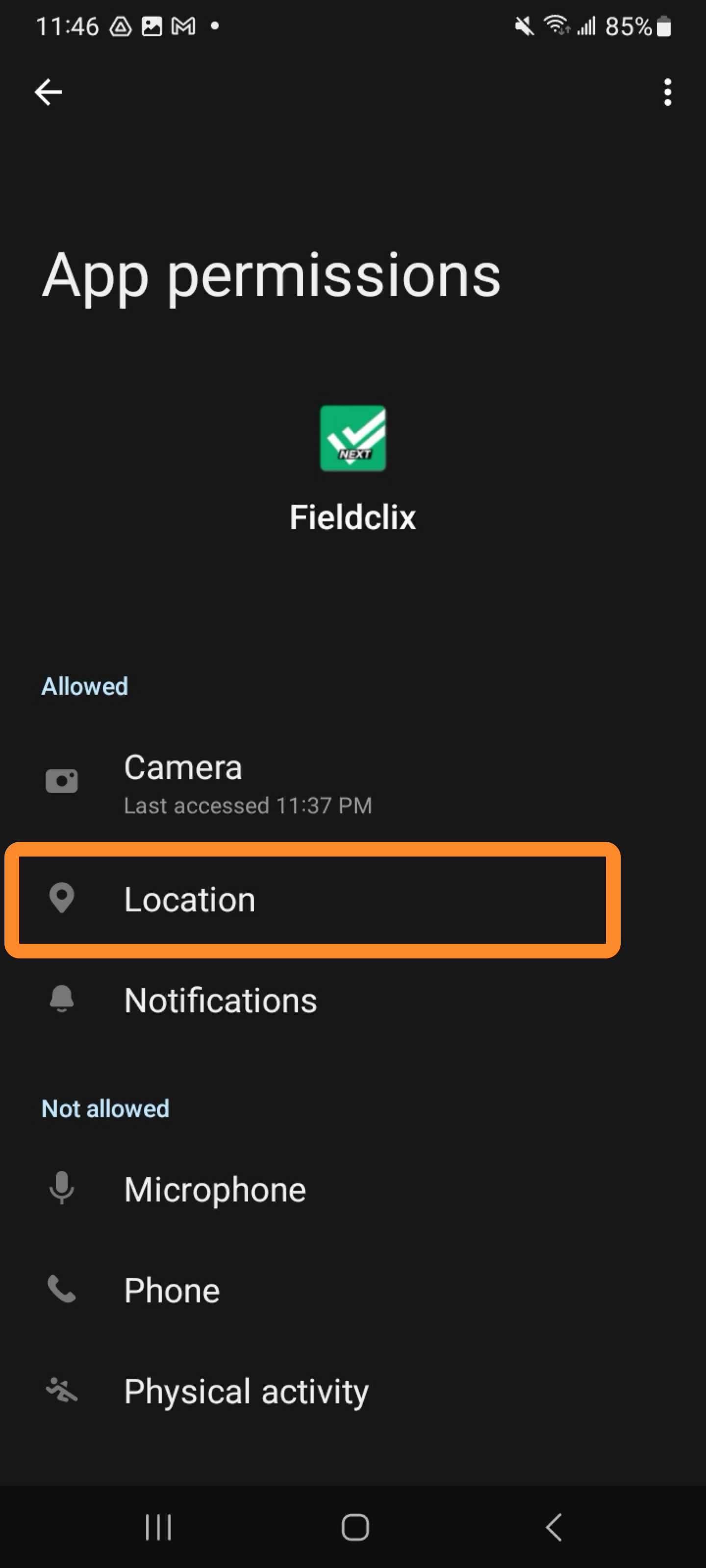 Ahora que está en la configuración del dispositivo para Fieldclix Next, el paso final es asegurarse de que los permisos relacionados con la ubicación sean correctos.