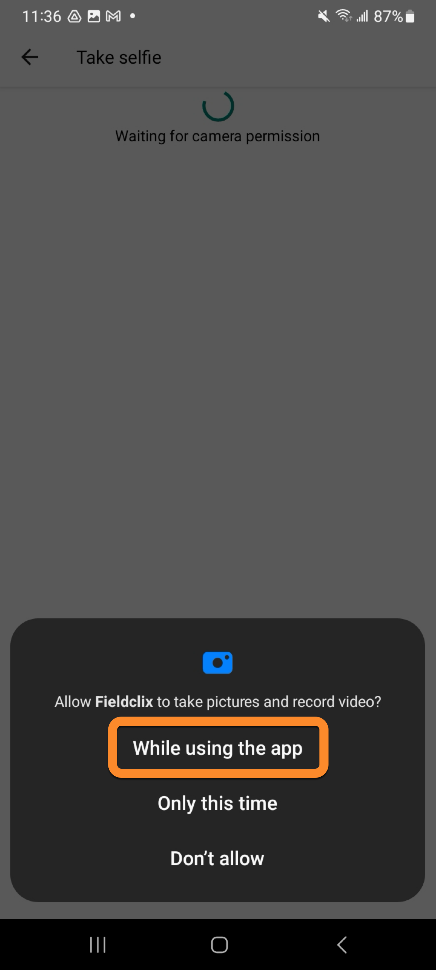 Si se le solicita que se tome una selfie en el registro de entrada, la aplicación le solicitará permiso para acceder a la cámara de su dispositivo. Debe permitir para continuar:
