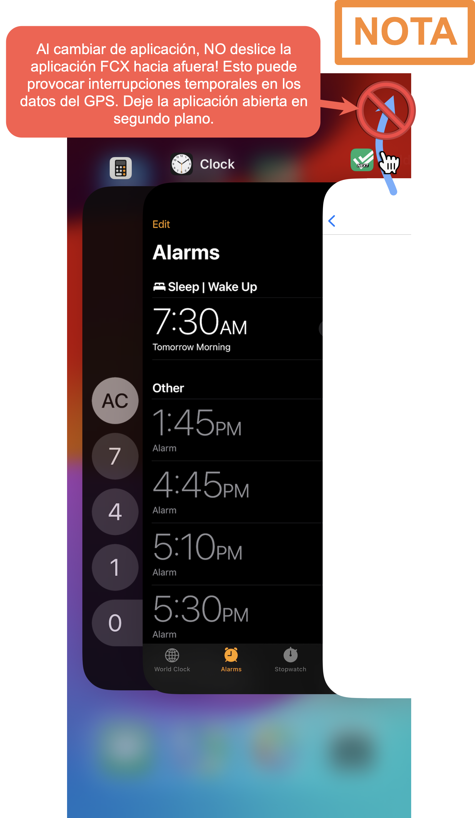 Cuando tocas el botón "cambiar de aplicaciones" en Android, puedes "deslizar" las aplicaciones para cerrarlas. ¡NO cierres la aplicación Fieldclix de esta manera! Simplemente déjala abierta en segundo plano cuando cambies a otras aplicaciones. Deslizar la aplicación para cerrarla puede causar brechas temporales en los datos del GPS.