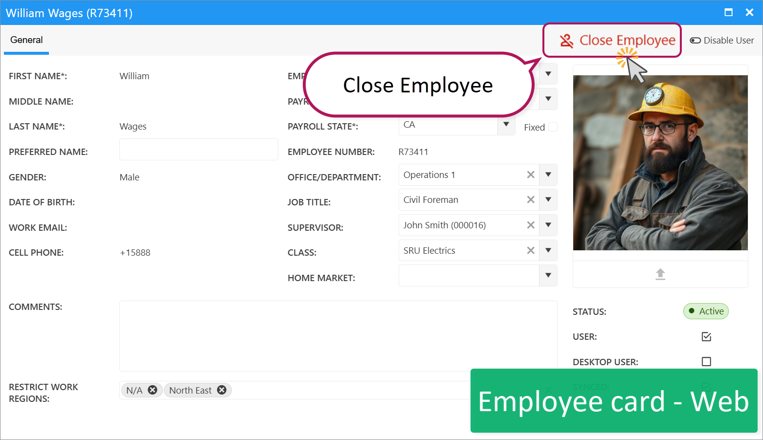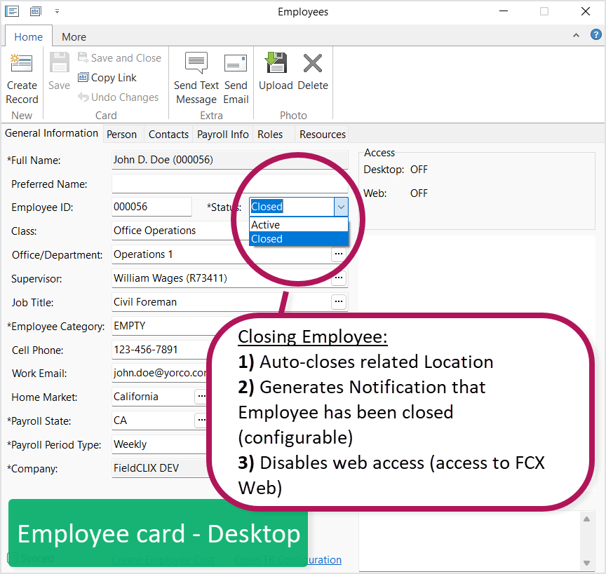 Begin off-boarding an Employee by changing the Status of their Employee card to “Closed.”