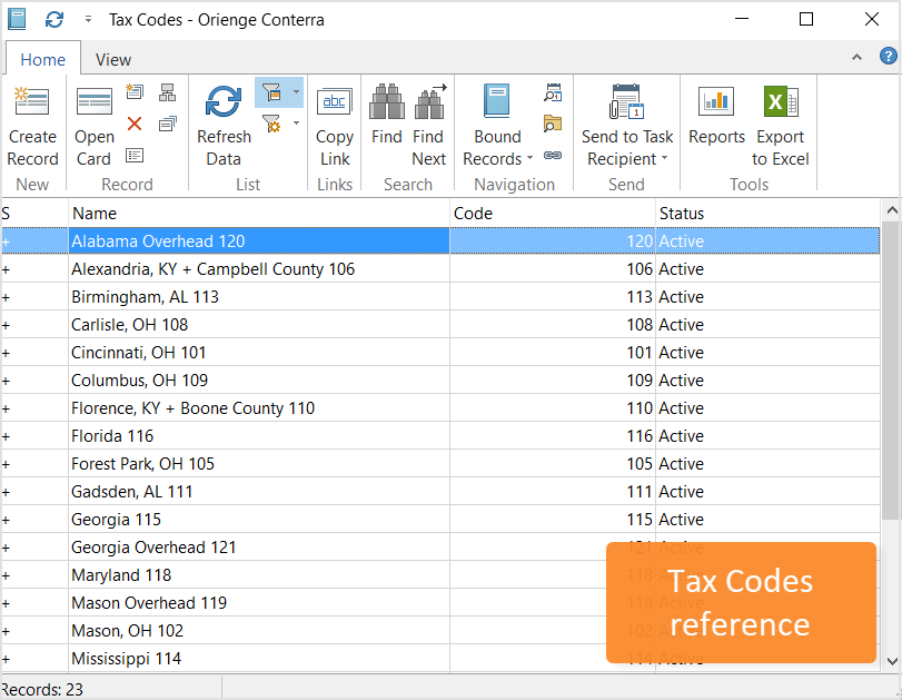 Tax Codes are identifiers for state or local tax jurisdictions (e.g., “AL Overhead 120” for Alabama, “CA Office 200” for California). They determine: