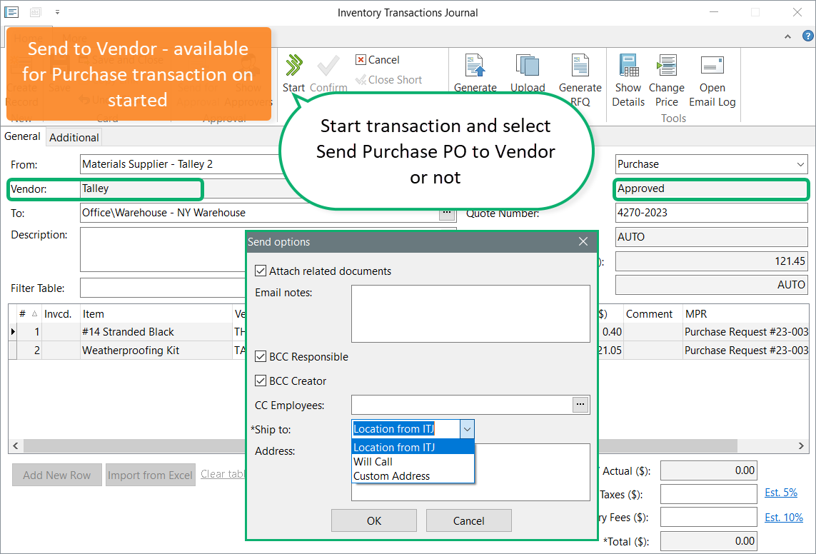 - Select what to enter the “Ship To” field. This can be a Location from the Inventory Transaction Journal, or a static “Will Call”, or Custom Address that you enter manually.