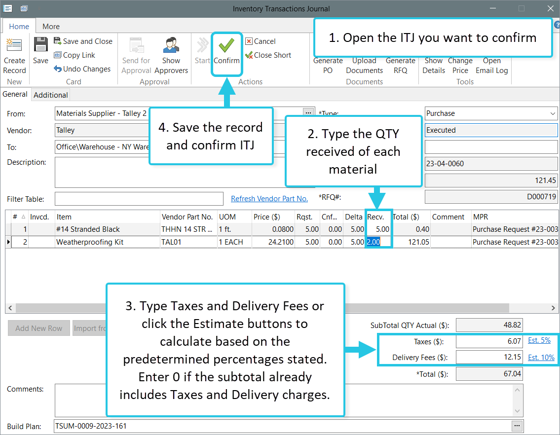 If the QTY received is less than the requested QTY, another executed ITJ is created for the difference.Please note that tax and delivery charges will only apply to certain types of ITJs. This is determined by the system setting. Typically, these are Purchase and Transfer transaction types, but can be changed at your request.Was this article helpful?