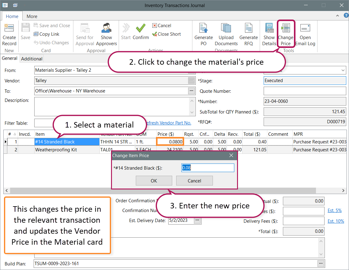 - This changes the price in the relevant transaction, transaction entries and updates the Vendor Price in the Material card.