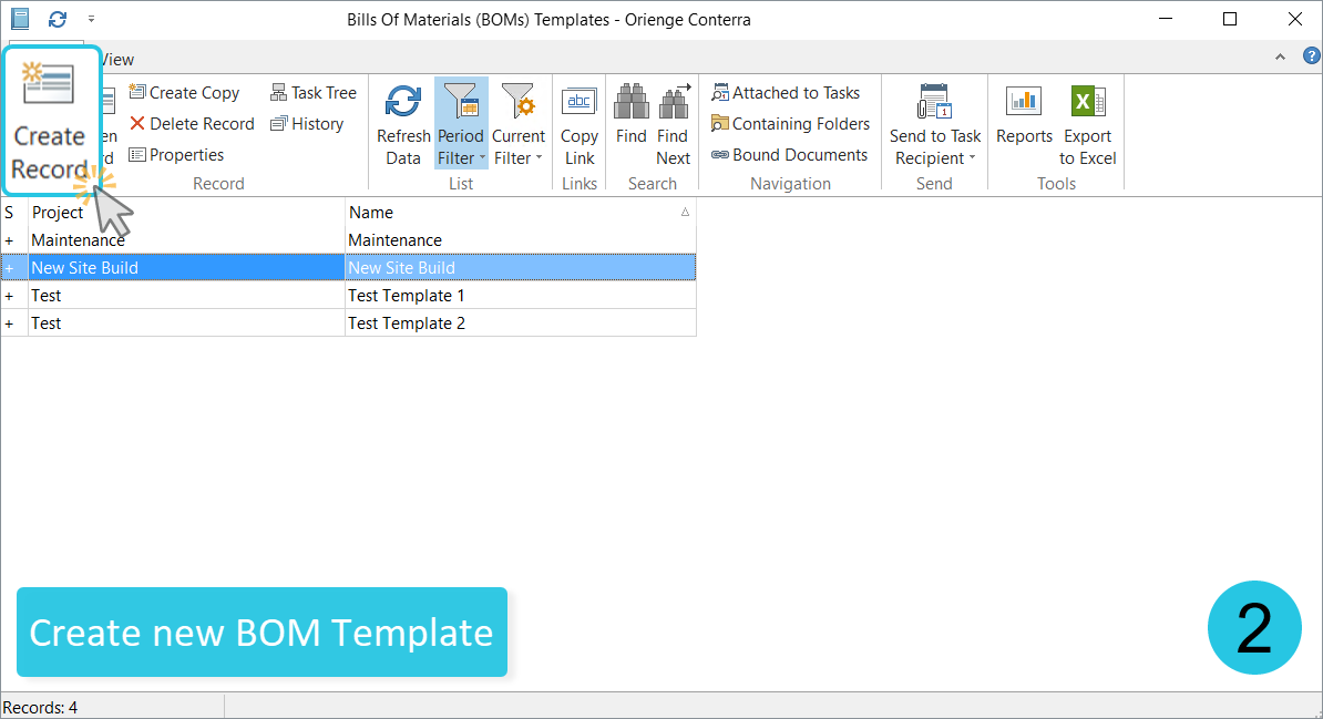 - In the BOM Templates reference, click the Create Record option at the top left.