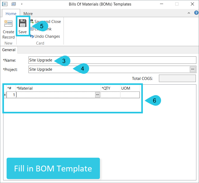 Create a Bill of Materials (BOM) Template to prefill the Bill of Materials with a predetermined list of materials specific to a project.