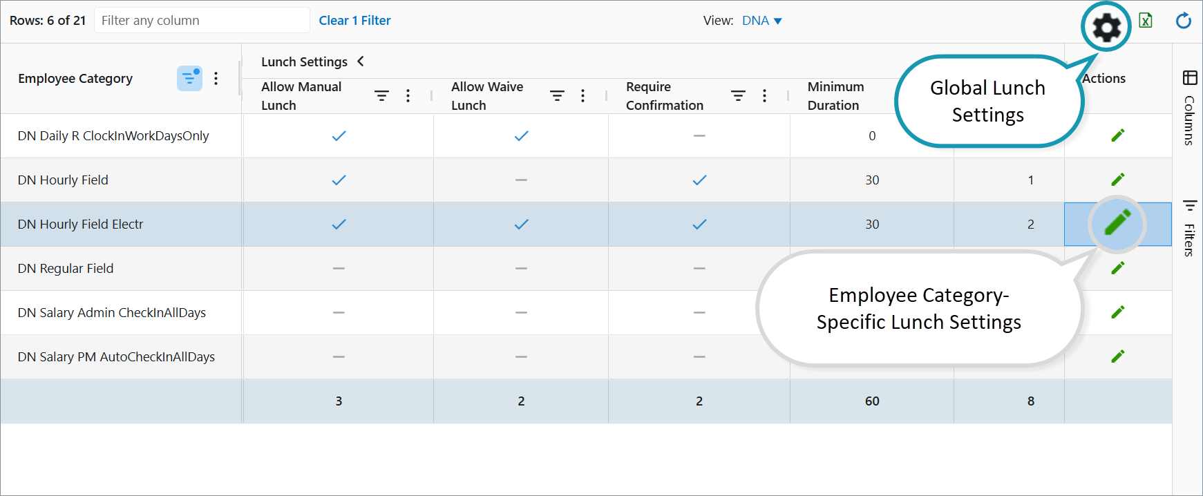 Employee Categories dashboard - Lunch Settings
