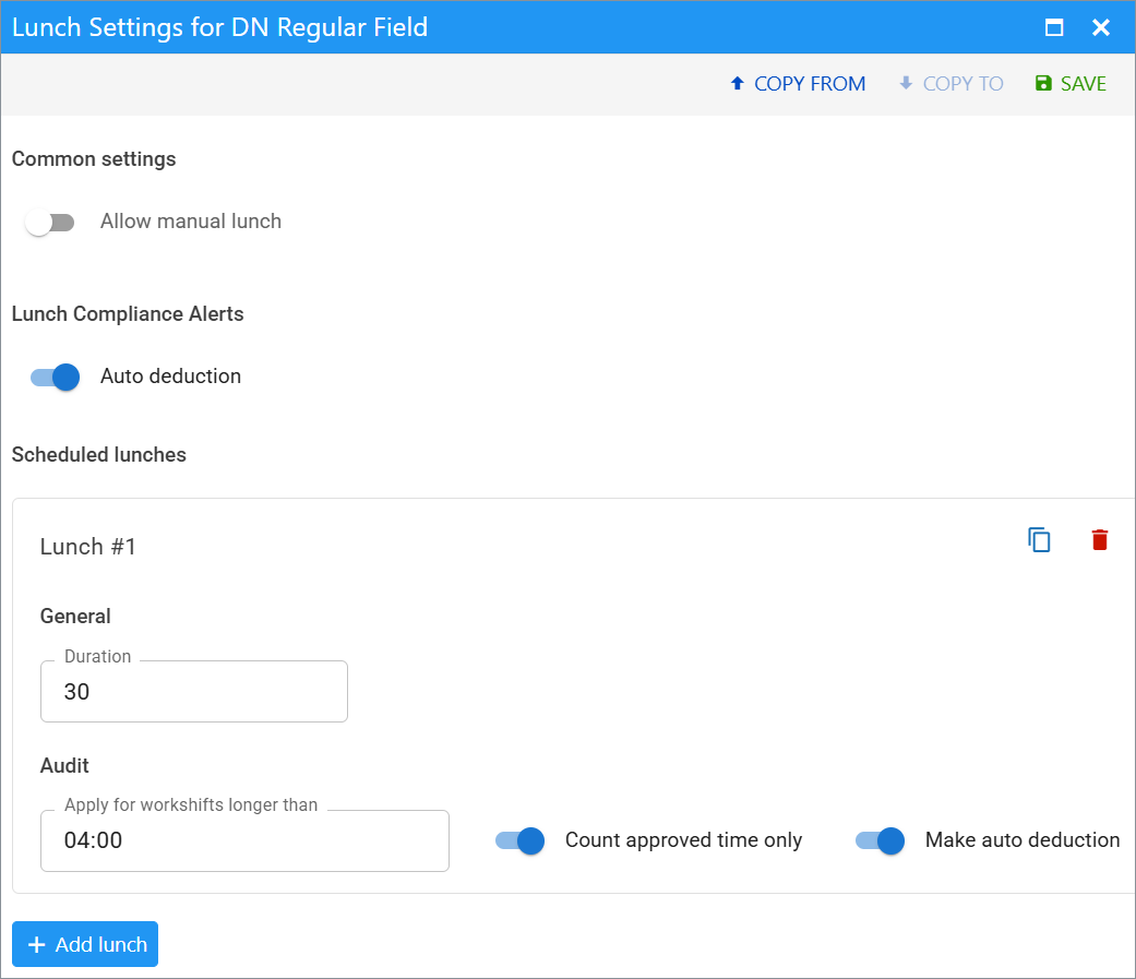 In the Scheduled Lunches section, click + Add Lunch to create auto-deduction rules. Example: deduct 30 minutes after 4 hours worked.