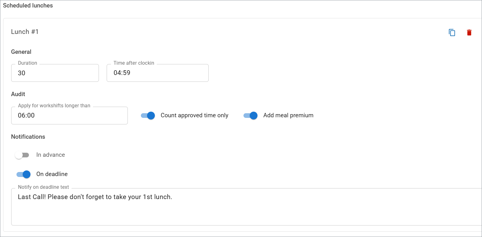 • On deadline – Turn on to notify the employee when the lunch window is about to close. Enter the notification text.