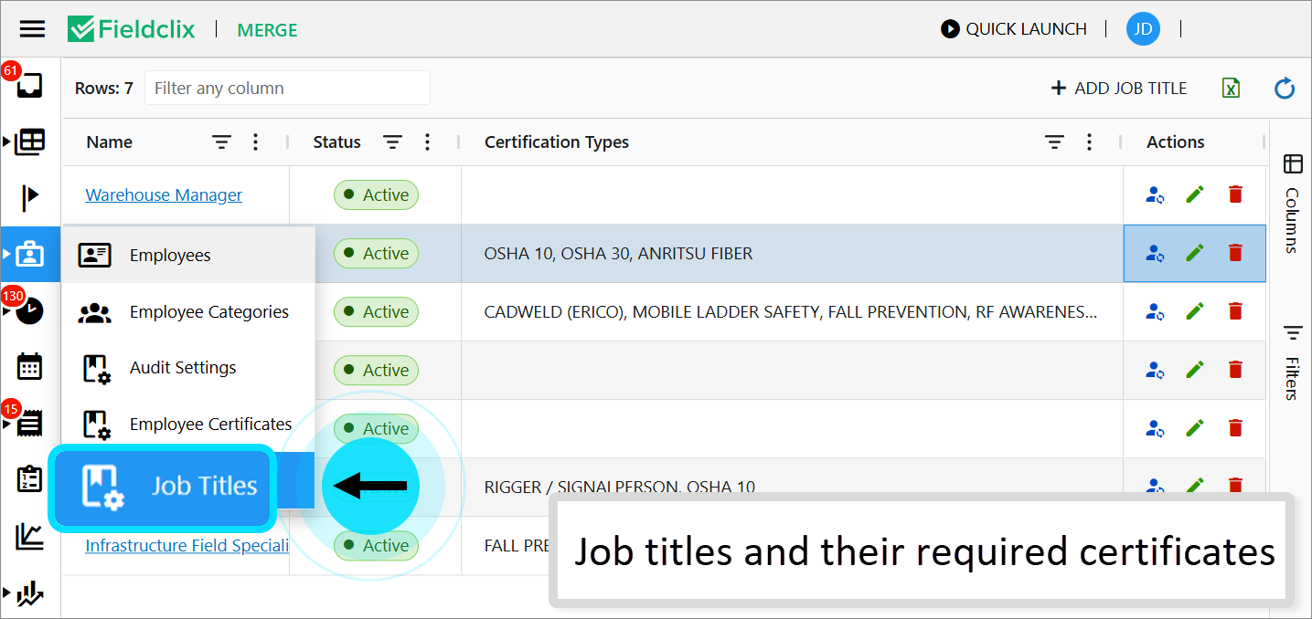 This dashboard lists all job titles and their required certificates.