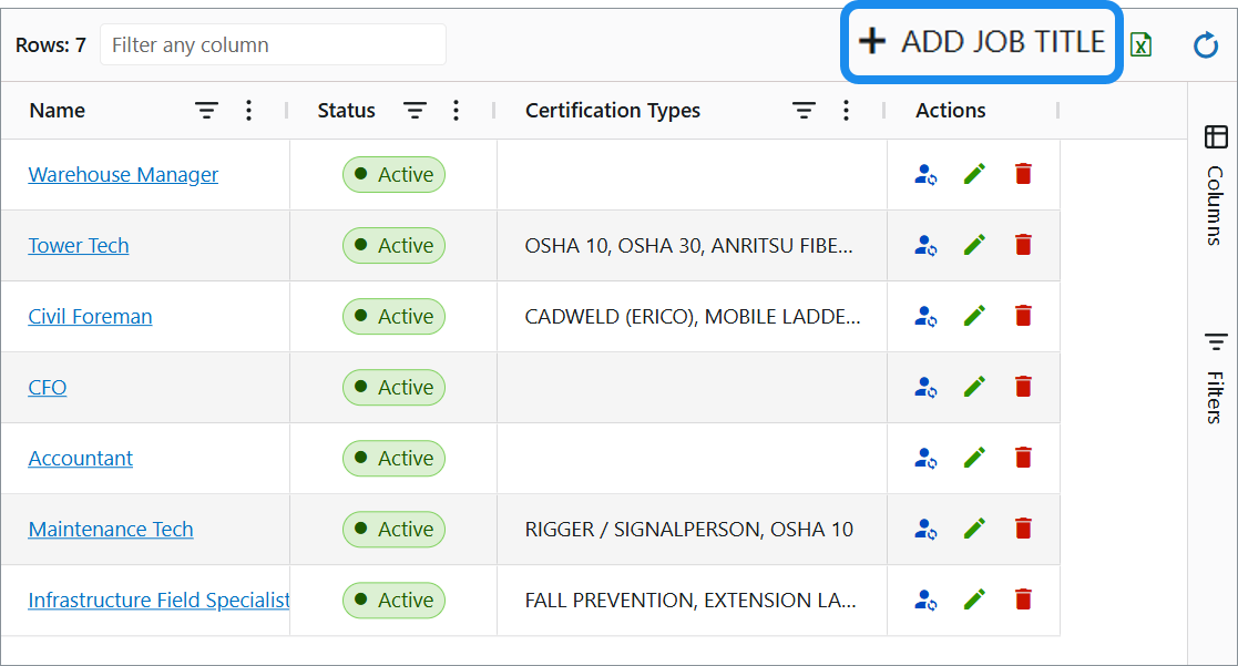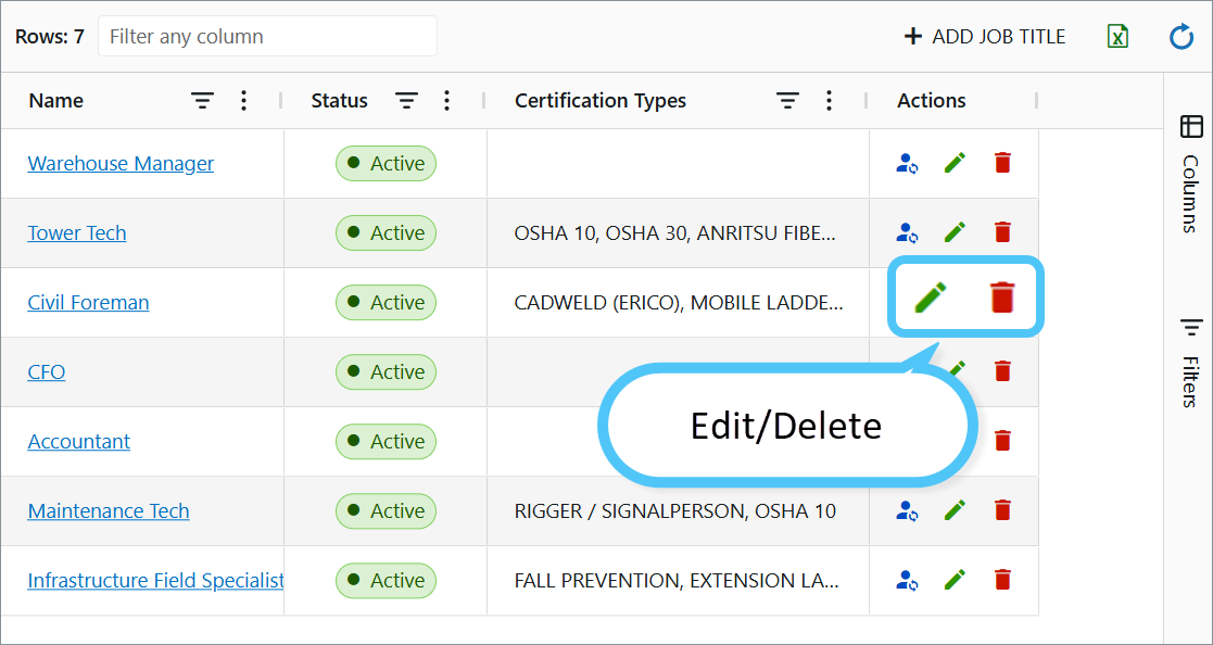 Edit: Click the Pencil icon to modify details—for example, update required certificate types or change the job title status (Active/Closed).